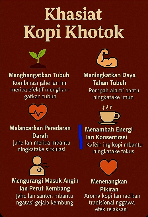 Aroma yang keluar begitu pekat dan menggoda, menghadirkan nuansa nostalgia pedesaan dan perbincangan hangat di warung kopi tradisional. Di pagi yang berkabut atau malam yang dingin, Kopi Khotok menjadi pelipur lara, pengikat cerita di antara petani, sopir truk, dan warga lokal yang menepi sejenak dari kesibukan hidup.