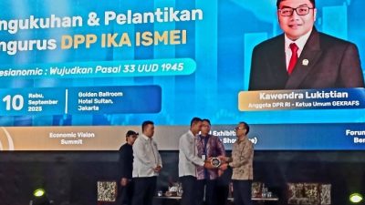 JAKARTA – Ikatan Alumni Ikatan Senat Mahasiswa Ekonomi Indonesia (IKA ISMEI) resmi mengukuhkan Dewan Pimpinan Pusat (DPP) periode baru. Acara berlangsung di Golden Ballroom, Hotel Sultan, Jakarta, Rabu (10/9/2025), dengan mengusung tema “Indonesianomic: Wujud Pasal 33 UUD 1945.”