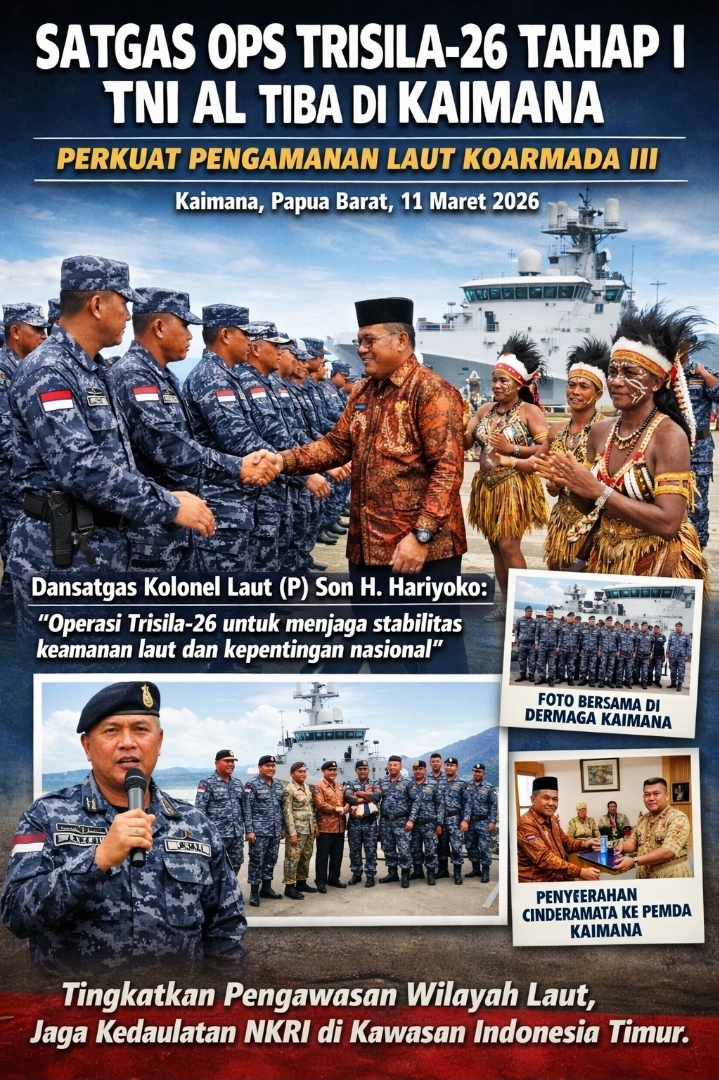 Kaimana – indonesiasatu928.com, Satuan Tugas (Satgas) Operasi Trisila-26 Tahap I TNI Angkatan Laut di bawah Komando Armada (Koarmada) III tiba di Kaimana, Papua Barat dan disambut jajaran Pemerintah Kabupaten Kaimana di Dermaga Kelas III Pelabuhan Kaimana, Rabu (11/3/2026).