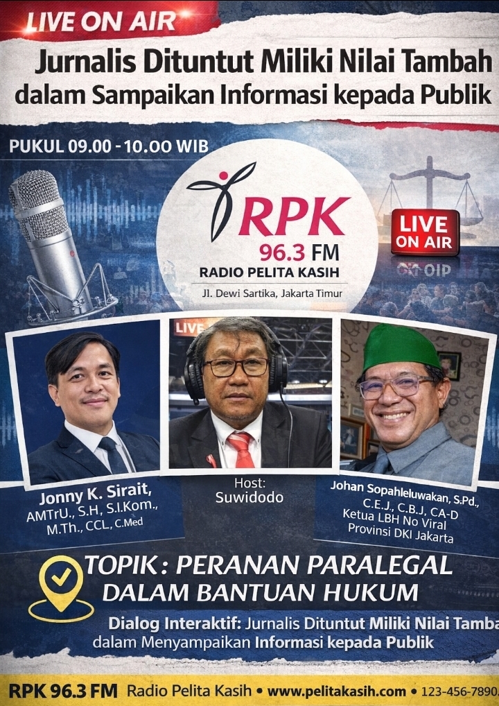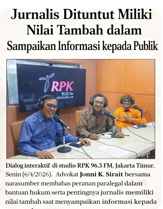 Hal tersebut disampaikan oleh advokat Jonni K. Sirait, AMTrU., S.H., S.I.Kom., M.Th., CCL., C.Med usai menjadi narasumber dalam dialog interaktif di RPK 96.3 FM, yang berlokasi di Jalan Dewi Sartika, Jakarta Timur, Senin (6/4/2026) pukul 10.10 WIB.