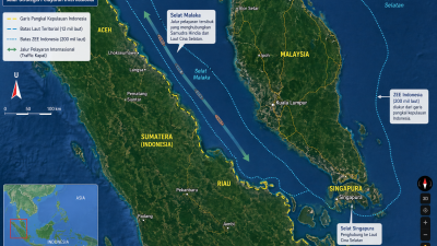 Peta kawasan Selat Malaka menampilkan rute pelayaran padat serta batas-batas maritim Indonesia dalam kerangka hukum internasional.